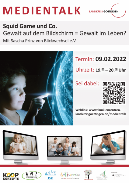 Der Landkreis Göttingen lädt Eltern, Fachkräfte und Interessierte zum Medientalk mit dem Thema „Squid Game & Co – Gewalt auf dem Bildschirm = Gewalt im Leben?“ am 09.02.2022 von 19.00 bis 20.00 Uhr ein.