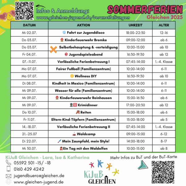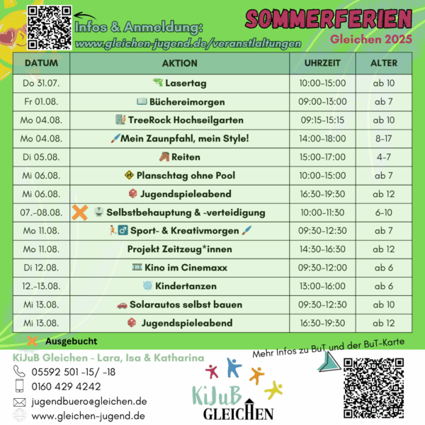 Das Kinder- und Jugendbüro Gleichen bietet in den Sommerferien ein vielfältiges Programm für Kinder und Jugendliche von 6 bis 19 Jahren an. Eine Anmeldung ist erforderlich und erfolgt online unter:
