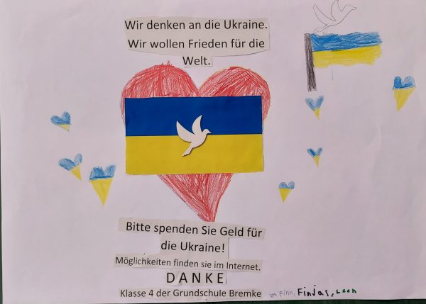 Wir Finjas, Finn und Leon aus der Klasse 4 der Grundschule Bremke haben Plakate gemacht, weil wir der Ukraine in so schwierigen Zeiten helfen wollen. Deshalb wollen wir zu Spenden aufrufen.
