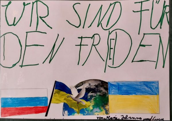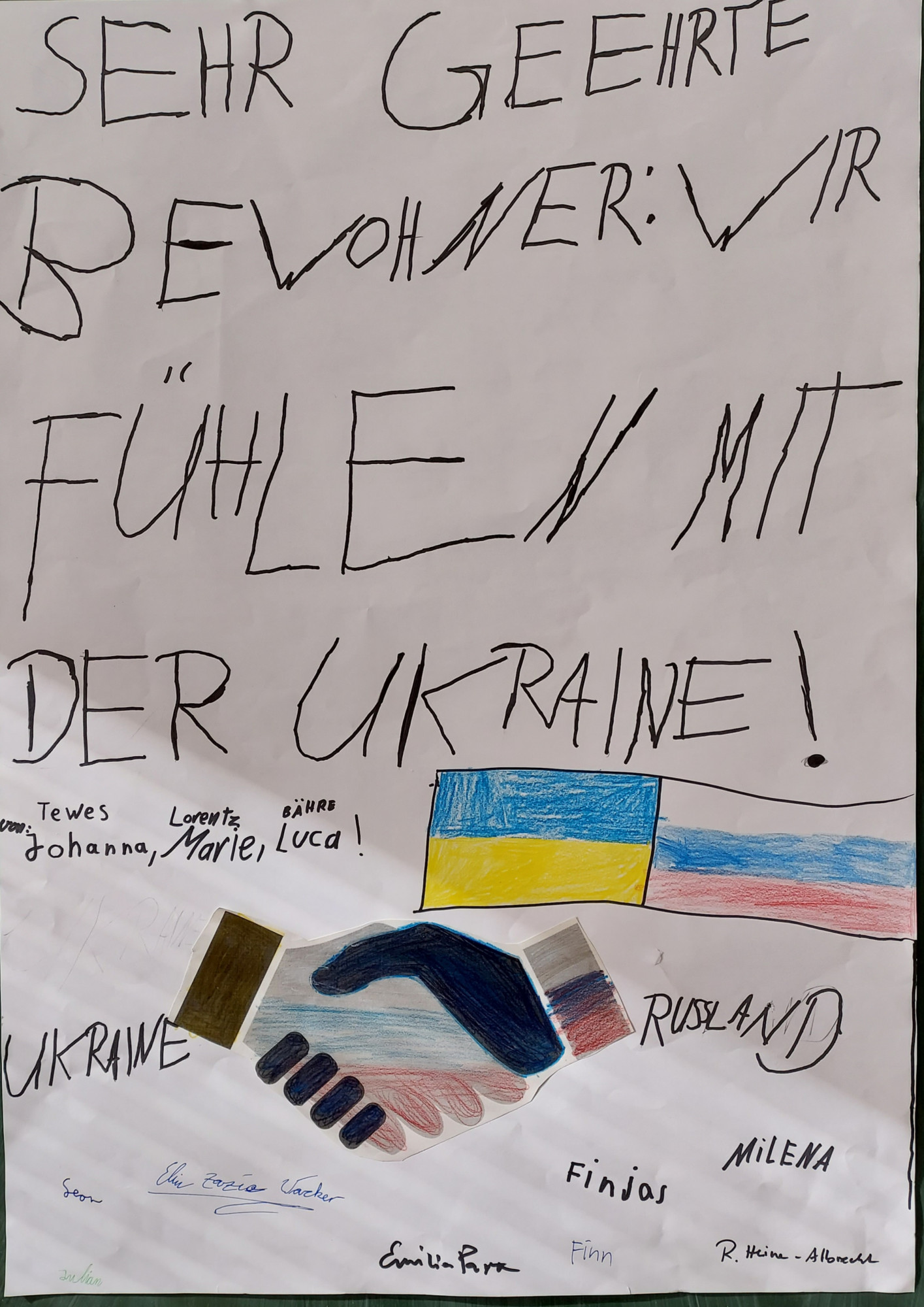 wir haben Plakate gemacht, weil: Wir möchten zeigen, dass wir den Frieden wollen. Für alle. Die Plakate haben wir in der Schule gemacht. Das war unsere Idee. Wir wollen helfen.