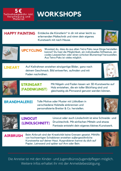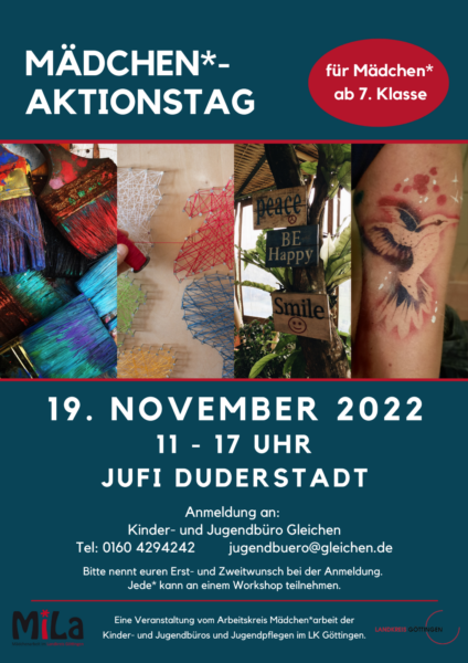 Verschiedene coole Workshops warten auf euch am 19.11. im JuFi Duderstadt. Gemeinsam fahren wir aus Gleichen los und treffen in Duderstadt viele Mädchen aus anderen Gemeinden. Habt ihr Lust, dabei zu sein? Schreibt uns einfach eine Nachricht (01604294242) oder eine Email (ju*********@******en.de). Kosten: 5€ inklusive Material und Verpflegung.
