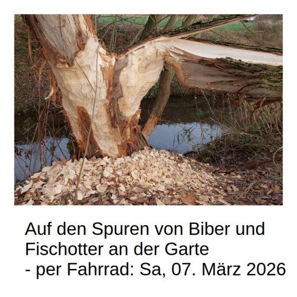 Biber und Fischotter sind seit wenigen Jahren auch in der Garte angekommen. Wir werden uns in Diemarden treffen und von dort die Garte aufwärts radeln (auf Radwegen, Gesamtstrecke bis zurück nach Diemarden ca. 12 km). Unterwegs werden wir – zu Fuß — Fraßspuren und Wechsel vom Biber erkunden und außerdem kennenlernen, welche Spuren der Fischotter hinterlässt. Mit etwas Glück finden wir auch eine Biberburg und einen Biberdamm.