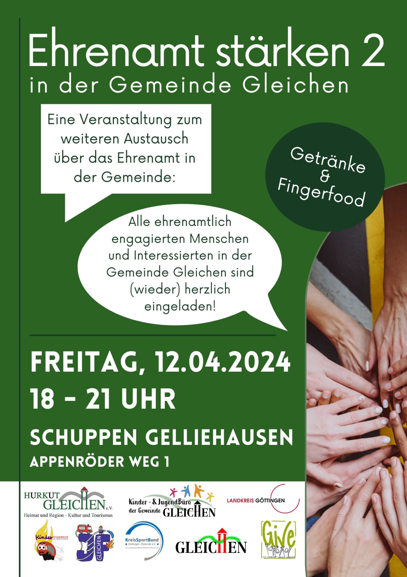 Nach der erfolgreichen Veranstaltung im November 2023 findet am 12.04.2024 die nächste Veranstaltung „Ehrenamt stärken“ von 18 bis 21 Uhr im Schuppen in Gelliehausen statt. Alle ehrenamtlich engagierten Personen aus der Gemeinde, unabhängig von der Teilnahme an der ersten Veranstaltung, sind herzlich eingeladen. Die Teilnahme an der Veranstaltung ist kostenlos. Getränke und Fingerfood werden bereitgestellt. Um eine Anmeldung bis zum 07.04.24 an jugendbuero@gleichen.de wird gebeten.
