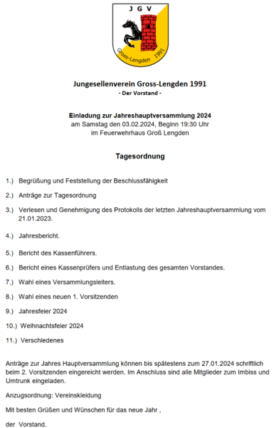 Jahreshauptversammlung Junggesellenverein Groß Lengden