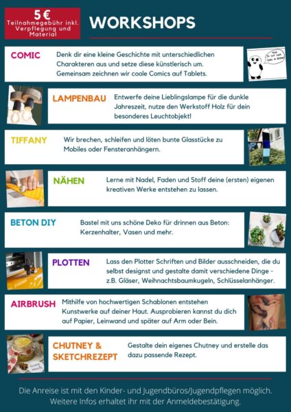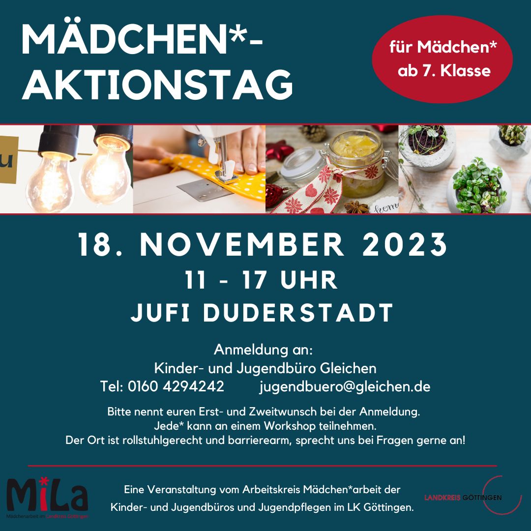 Am Samstag, 18.11.2023 findet von 11-17 Uhr der jährliche landkreisweite Aktionstag für Mädchen* ab der 7. Klasse in Duderstadt statt. Es werden tolle Workshops angeboten, z.B. Lampenbau, Beton DIY, Nähen, Plotten und Chutney selber machen.