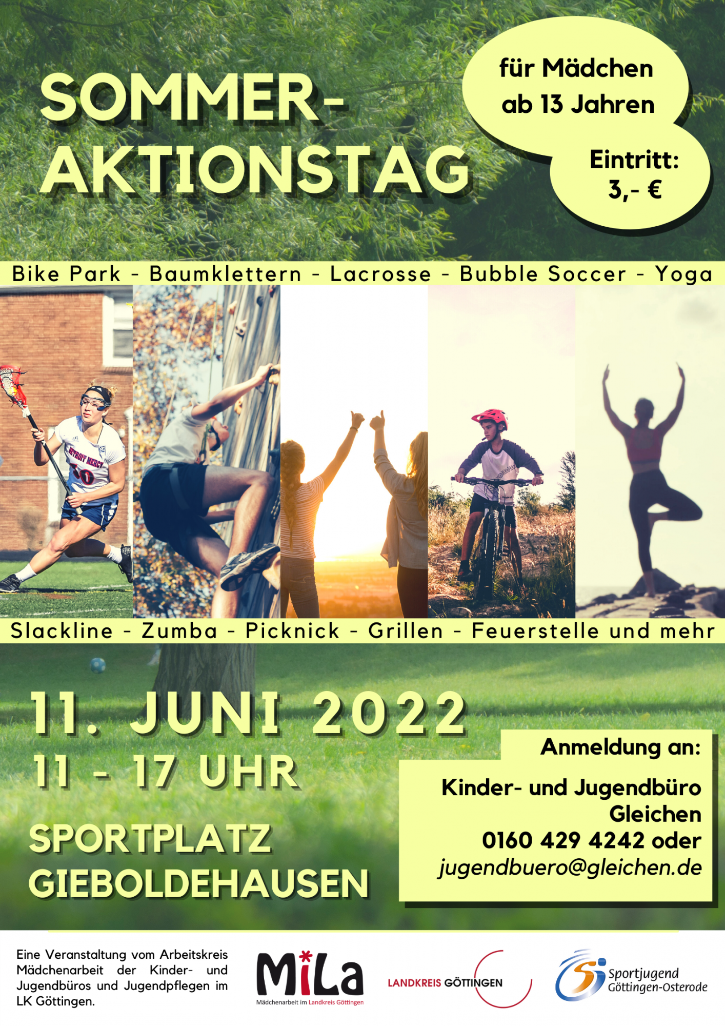 Bike Park, Baumklettern, Bubble Soccer, Lacrosse und mehr – vielseitige Aktionen erwarten Mädchen* ab 13 Jahren aus dem Landkreis Göttingen am 11. Juni 2022! Auf dem Gelände des Sportplatzes in Gieboldehausen mit dem angrenzenden Bike Park wird dafür eine Bewegungslandschaft aufgebaut. Hier können sich die Teilnehmenden in verschiedene Sport- und Bewegungsmöglichkeiten ausprobieren. Auch das gemeinsame Grillen, Picknick und Zusammensitzen an der Feuerstelle stehen im Vordergrund. Der Aktionstag gibt Mädchen* die Möglichkeit, gemeinsam draußen aktiv zu sein und sich bei verschiedenen (Trend-)Sportarten auszuprobieren. Weitere Infos und Anmeldung unter: www.gleichen-jugend.de