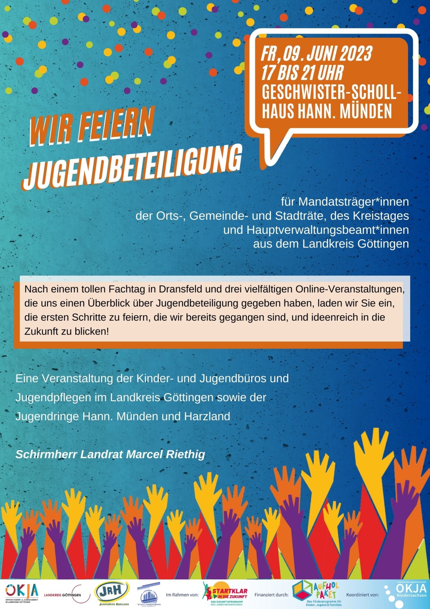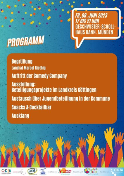 Am Freitag, 09.06.2023 findet um 17 Uhr in Hann. Münden die Veranstaltung „Jugendbeteiligung“ statt. Herzlich eingeladen sind Mandatsträger*innen der Orts-, Gemeinde- und Stadträte, des Kreistages und Hauptverwaltungsbeamt*innen aus dem Landkreis Göttingen sowie Interessierte.