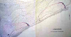 Der aktueller Lageplan der Lengder Burg bzw. der beiden Anlagen nebeneinander ist als topografische Karte mit verfeinerten Höhenlinien, allerdings nur als Ausschnitt, dargestellt. Für ungeübten Kartenleser ist diese Karte nicht leicht zu verstehen.