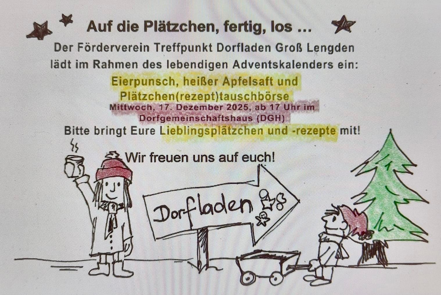 Plätzchen genießen und neue Rezepte kennenlernen? Ihr seid herzlich eingeladen am 17.12., 17 Uhr ins DGH: Bringt Eure Lieblingsplätzchen (Zutaten? Findet Ihr im Dorfladen 😉) und das Rezept dafür ausgedruckt mit und genießt Plätzchenvielfalt mit heißem Saft und Eierpunsch. Wir freuen uns auf Groß und Klein! Euer Förderverein Dorfladen